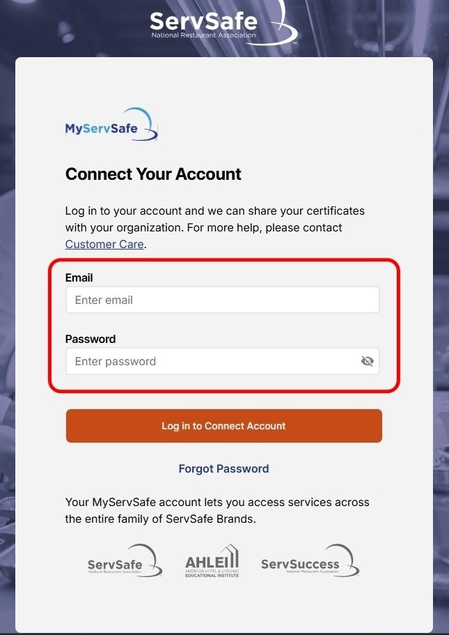 If you have a current ServSafe account you may login with your email and password on the Connect Your Account page.