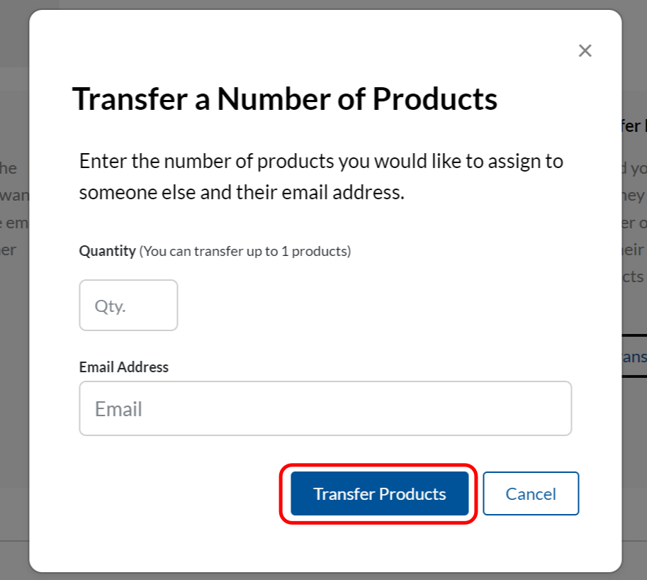 In the pop up, enter the quantity of keys you want to transfer and the email address of the recipient. Then select Transfer Products to complete the transfer.