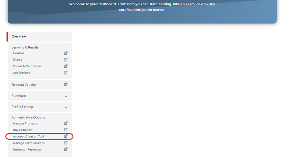 As an Account Creation Tool Manager, you have access to the tool within your My Account dashboard. You may login and locate it under the Administrative Options section.