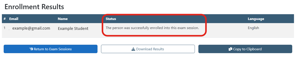 The system will validate that there are enough exam credits for this student(s) to be enrolled into this session and the status will display Enrolled.