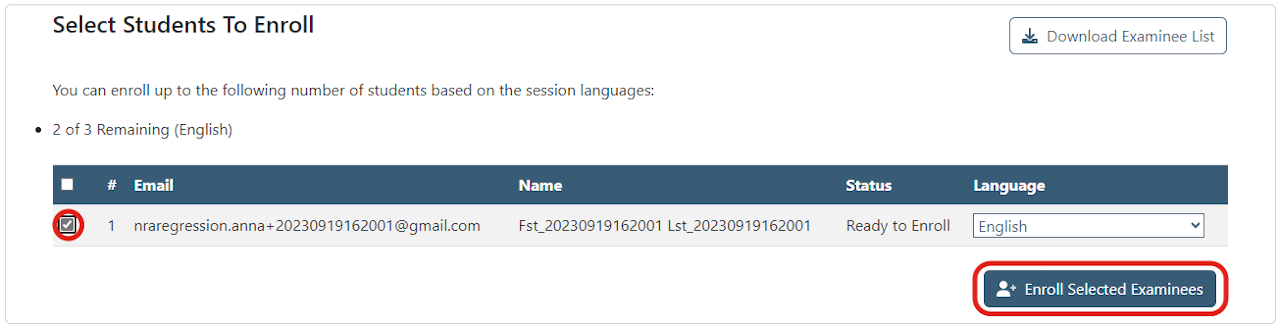 Select the student and select Enroll Selected Examinees.