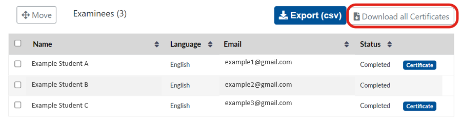 The status for each student will be listed here. The Instructor can download individual or all certificates from this page.