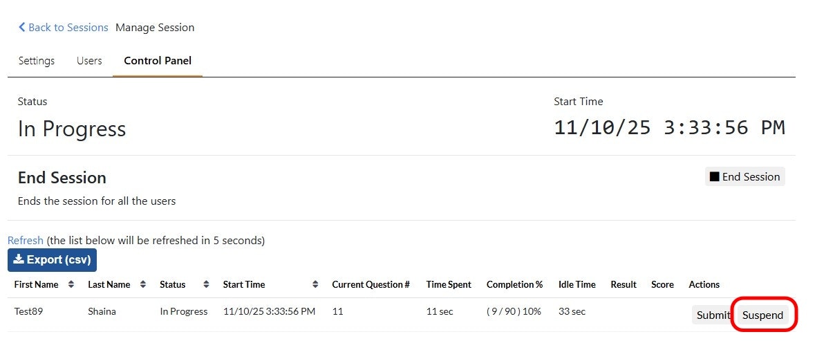 Select the Control Panel tab to review your examinee's exam. You may select Suspend to stop the examinee during their test