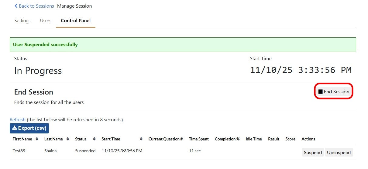 Now that the user's exam is suspended, and they can no longer continue, you may select End Session and submit an email to Examsecurity@restaurant.org of the incident.