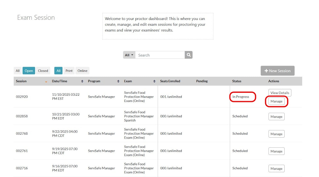 On your MyServSafe Dashboard, select Manage Exam Sessions.